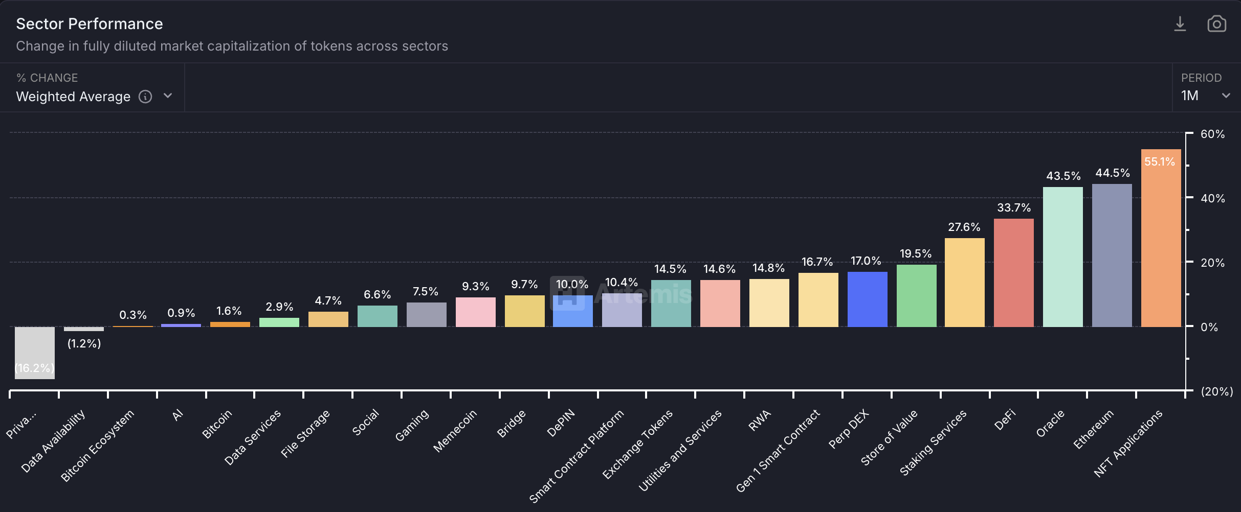 Dữ liệu từ Artemis tiết lộ rằng RWA chỉ tăng 14.8% trong tháng qua. Con số này khá thấp, đặc biệt khi so sánh với sự tăng trưởng mạnh mẽ đã thấy trong non-fungible tokens (NFTs), Ethereum, tài chính phi tập trung (DeFi) và các lĩnh vực khác.