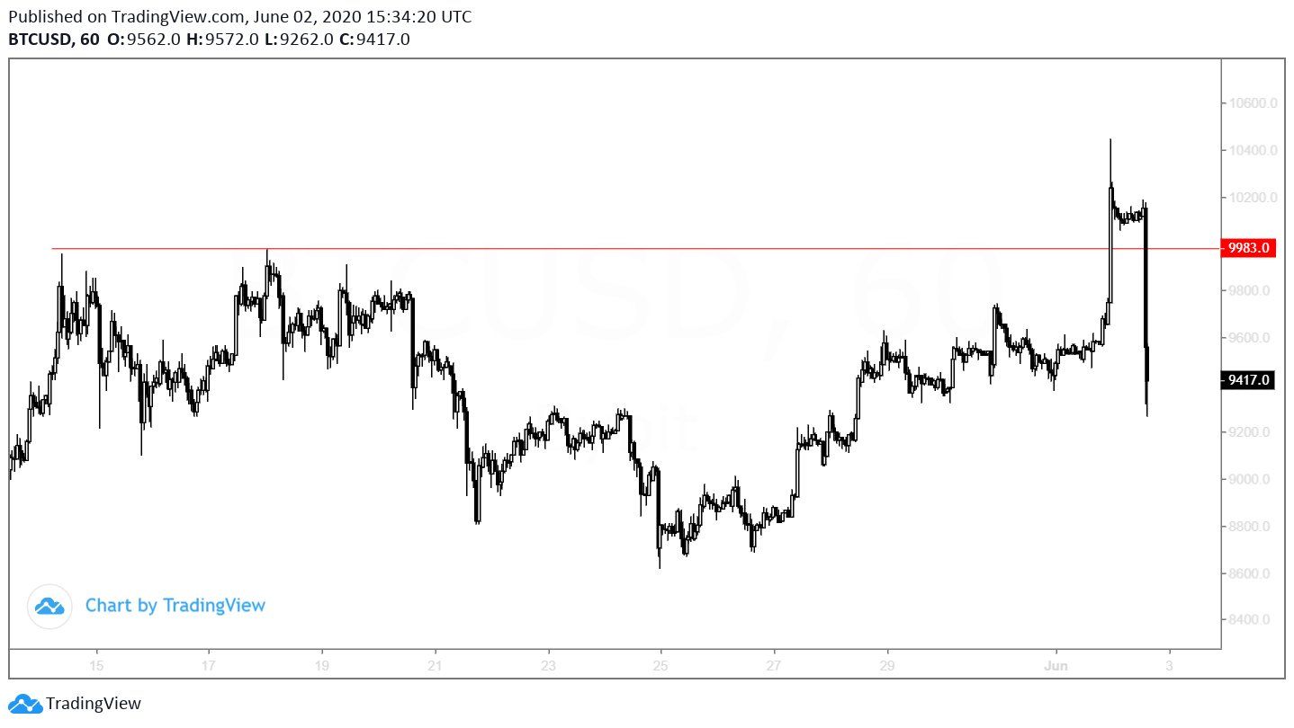 Chuyển động mới nhất đã dẫn Bitcoin xuống gần đến khu vực hỗ trợ chính tại 9.300 USD sáng nay (3/6). Đây dường như cũng là ngưỡng hỗ trợ cuối cùng cho đồng coin này khỏi sụt giảm xuống khu vực 8.600 USD.
