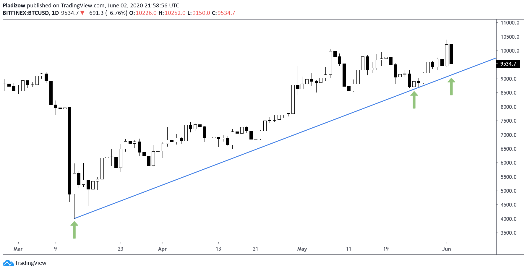 Qua biểu đồ cho thấy, sụt giảm giá sáng nay đã dừng tại địa điểm của một xu hướng đi lên được hình thành từ đáy 3.700 USD của tháng 3. Điều đó cho thấy, thị trường giá tăng Bitcoin vẫn được duy trì nhìn theo góc độ trung hạn. Tuy nhiên, Bitcoin vẫn nằm dưới ngưỡng kháng cự 10.500 USD.
