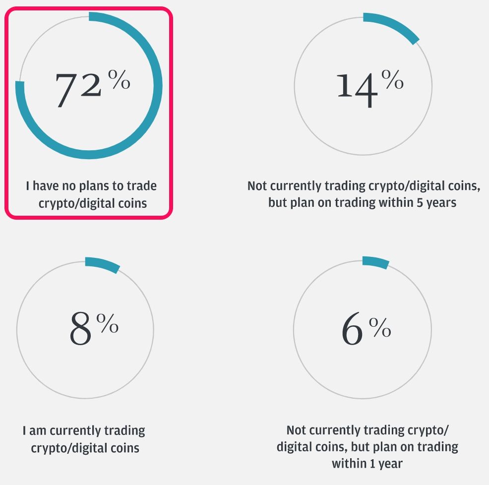 Có đến 72% các nhà tổ chức đã trả lời rằng: “Tôi không có kế hoạch giao dịch Crypto trong 5 năm tới.”. 14% nói rằng “Hiện không có kế hoạch giao dịch Crypto nhưng có kế hoạch giao dịch trong 5 năm tới”. Chỉ 8% nói rằng “Tôi đang giao dịch Crypto”. và 6% nói rằng “Hiện không giao dịch crypto nhưng có kế hoạch giao dịch trong 1 năm.”.
