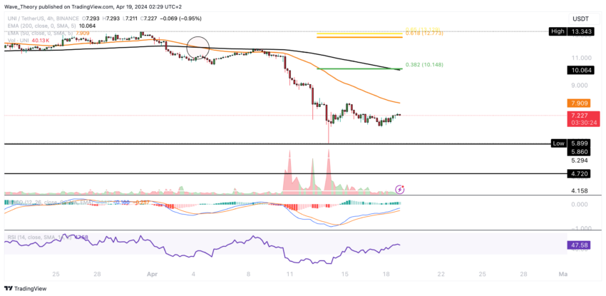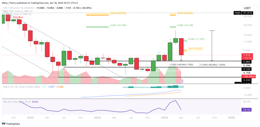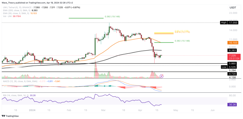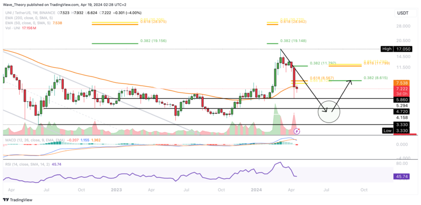 Với việc Uniswap phá vỡ mức hỗ trợ tỷ lệ vàng ở mức khoảng 8.5 USD, nó hiện đang tìm kiếm mức hỗ trợ đáng kể từ 4.72 USD đến 5.86 USD. Điều này cho thấy một thời điểm quan trọng đối với Uniswap khi nó điều hướng các mức hỗ trợ này trong điều kiện thị trường rộng lớn hơn.