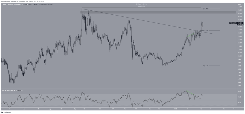 ATOM, mã thông báo gốc của hệ sinh thái Cosmos, đã tăng kể từ ngày 17/12. Xu hướng tăng đã dẫn đến mức giá cao nhất trong năm là 15.23 USD vào ngày 02/2. Hơn nữa, giá ATOM đã vượt qua ngưỡng kháng cự giảm dần vào ngày 01/2. Sự bứt phá này rất quan trọng vì hai lý do chính: