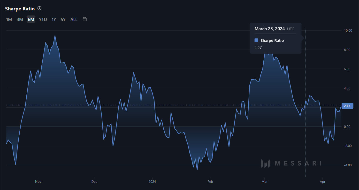 Sự tăng giá của NEO đã dẫn đến giá trị thị trường tổng thể của Altcoin này tăng đáng kể, do đó sẽ dẫn đến lợi nhuận cao hơn. Điều này được chứng minh bằng tỷ lệ Sharpe, hiện đang ở mức 2.17. Tỷ lệ Sharpe đo lường lợi tức điều chỉnh rủi ro của một khoản đầu tư. Nó cho biết lợi nhuận mà một khoản đầu tư tạo ra trên mỗi đơn vị biến động. Giá trị cao hơn là một dấu hiệu của lợi nhuận cao hơn.