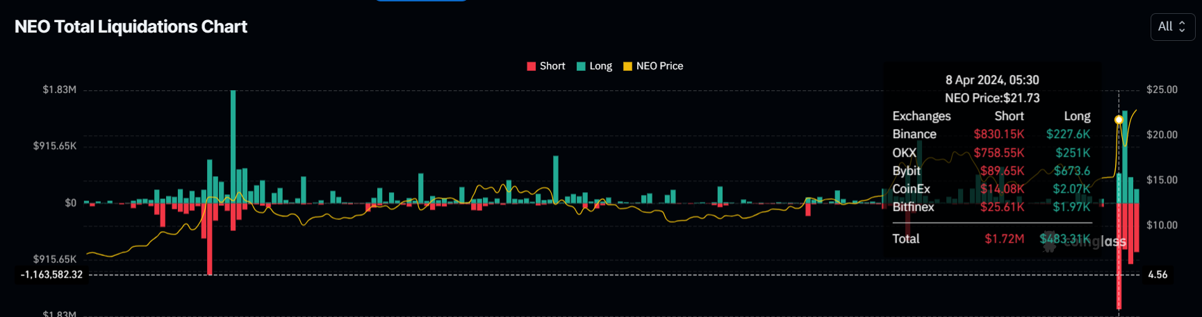 Hơn nữa, những phát triển gần đây cũng sẽ khiến những con gấu tránh xa. Điều này là do những nỗ lực của họ trong việc thu lợi nhuận từ việc điều chỉnh giá đã không được đền đáp. Việc thanh lý đã bị chi phối bởi các hợp đồng ngắn trong bốn ngày qua. Trong khoảng thời gian này, gần 4 triệu USD thanh lý đã được ghi nhận, có khả năng ngăn cản những con gấu đặt cược giảm giá nữa. Do đó, giá NEO ghi nhận sự phục hồi tăng giá.