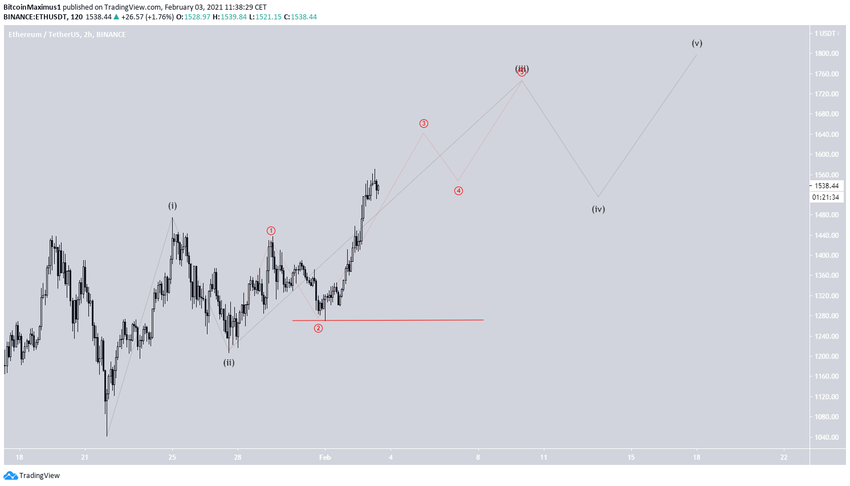 ETH được cho là đang ở trong làn sóng phụ 3 đang kéo dài (màu đen). Số lượng sóng phụ nhỏ được đánh dấu bằng màu đỏ.