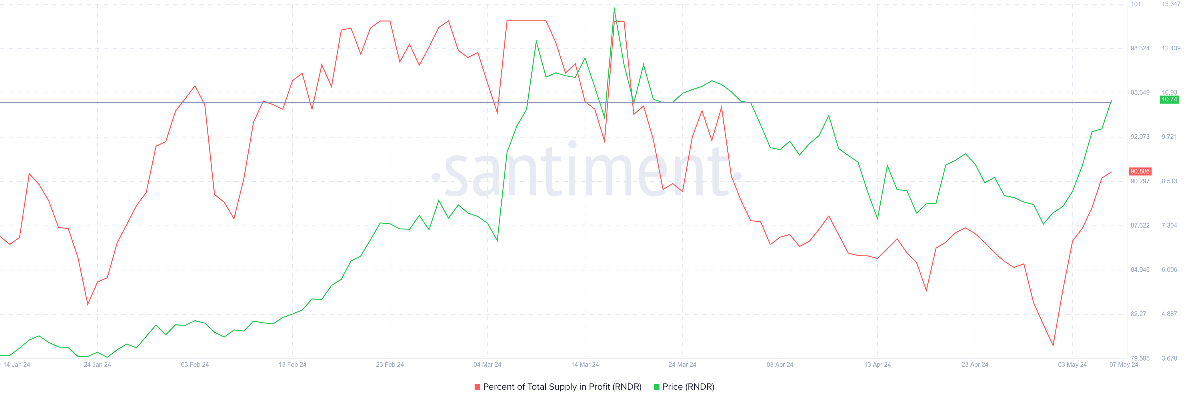 Hiện tại, giá của Render vẫn còn dư địa cho sự tăng trưởng mặc dù thực tế là gần 90% nguồn cung đã có lợi nhuận. Nói chung, đỉnh thị trường được hình thành khi khoảng 95% nguồn cung của tài sản có lãi. Đỉnh thị trường này được theo sau bởi các đợt điều chỉnh, dẫn đến một sự hạ nhiệt.