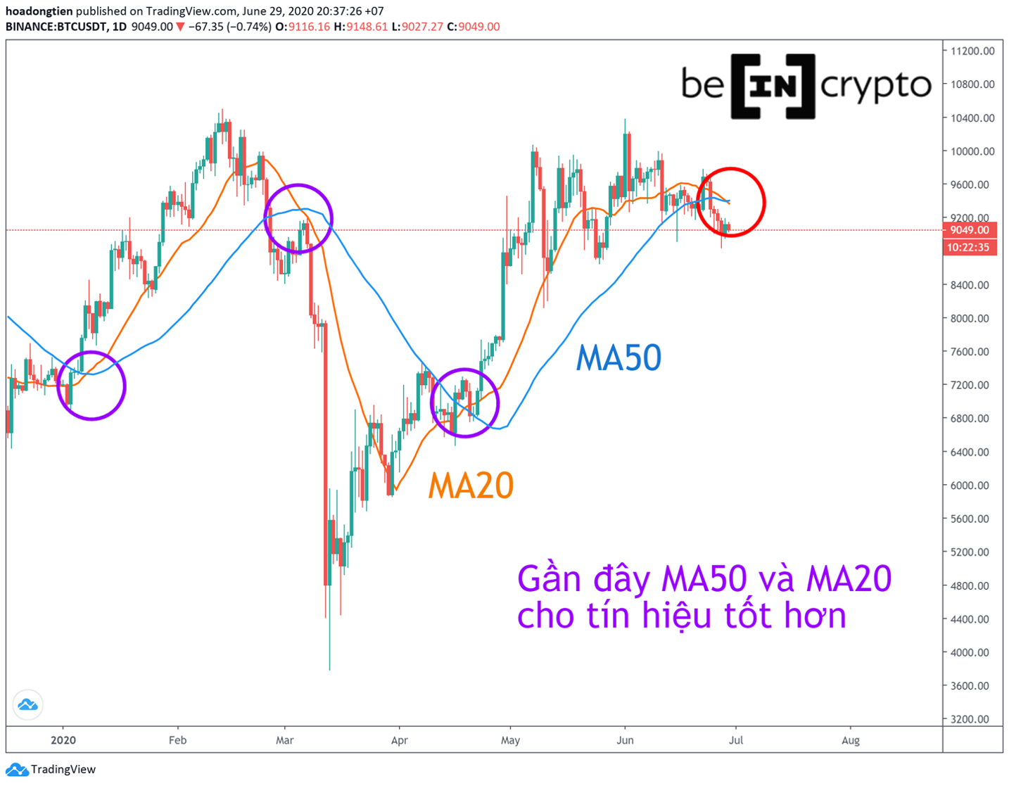 Chính vì số chu kỳ ít hơn, nên những đường MA này biến động nhanh hơn và gần đây cho tín hiệu tốt hơn. Có thể thấy, trong tình hình hiện tại, đường MA20 đã cắt xuống MA50. Đây là một tín hiệu xấu trong tháng 7.
