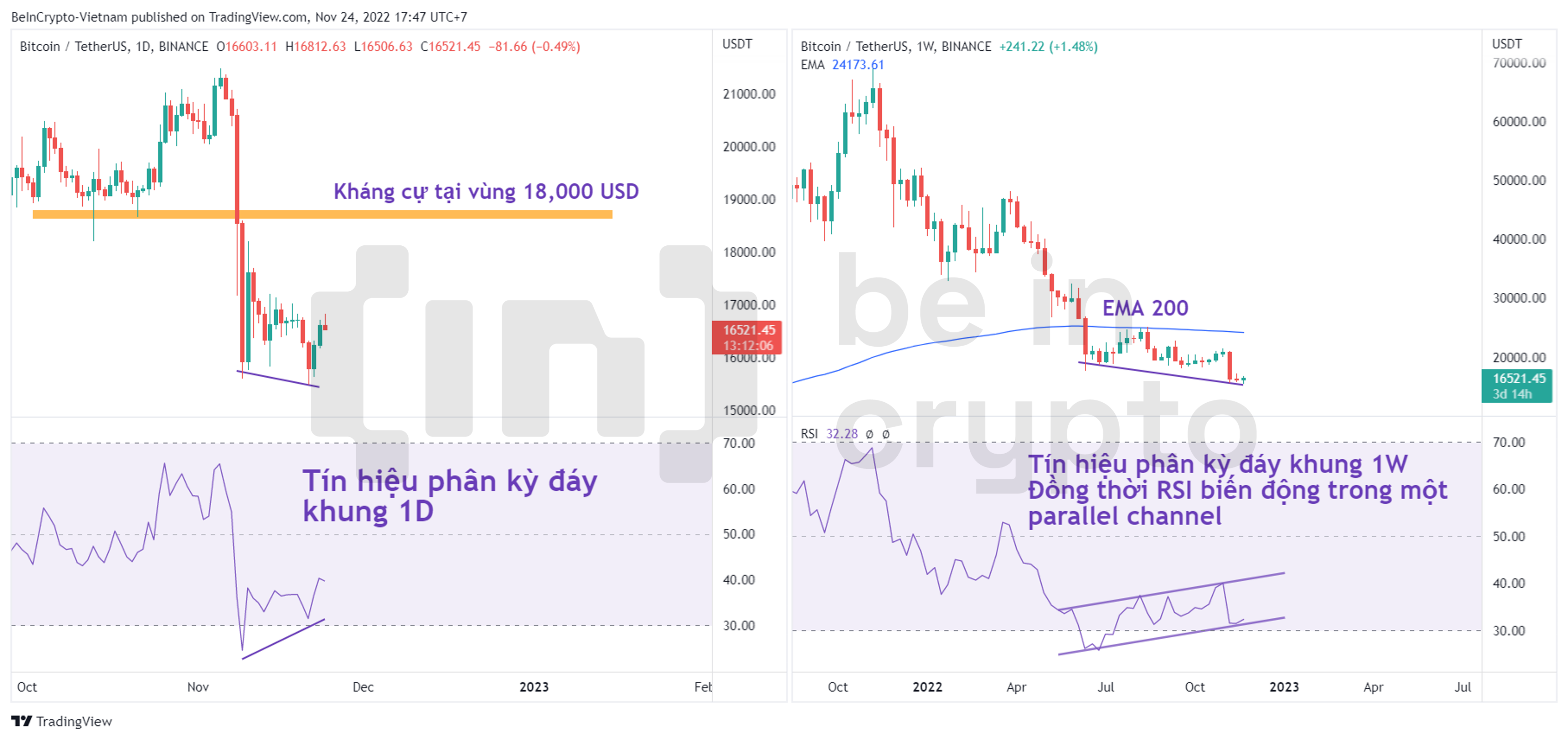 Kết hợp hai quan sát trên, giá ghi nhận tín hiệu phân kỳ kép Bitcoin. Từ đó, chúng ta có cơ sở từ phân tích kỹ thuật để dự đoán đà phục hồi của giá. Nếu đà phục hồi này xảy ra thì kháng cự gần của BTC khung 1D ở vùng 18,000 USD – 19,000 USD. Còn kháng cự khung 1W chính là đường WMA200. Nhưng vẫn còn quá sớm để dự đoán giá có khả năng tăng đến WMA200 hay không.