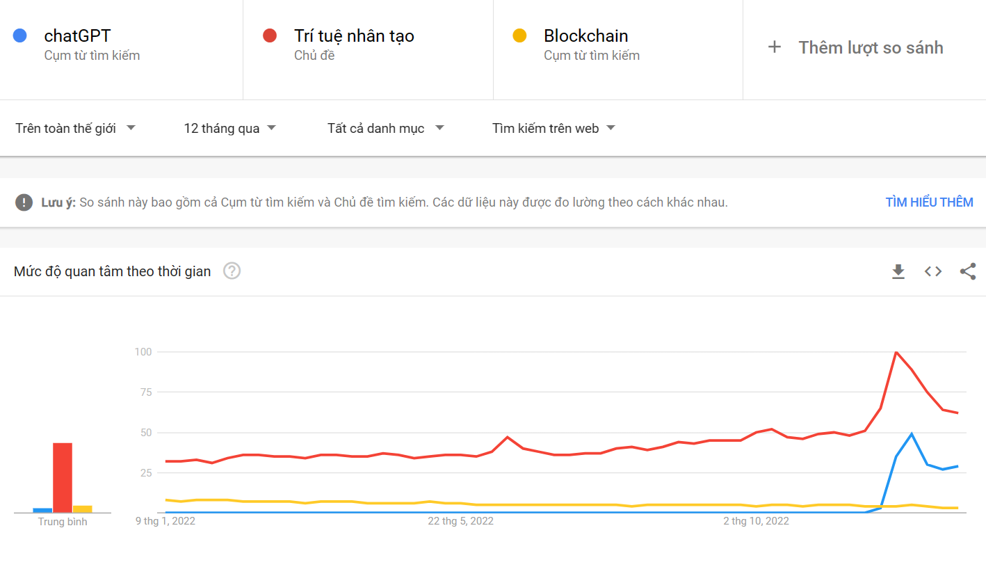 Đặc tính của thị trường Crypto là nhà đầu tư thích nghe những câu chuyện mới. Câu chuyện ICO, IDO, DeFi, NFT, Metaverse với họ đã cũ. Và thế giới công nghệ đang đổ dồn sự chú ý vào AI và Chatbot. Dữ liệu Google Trend cho thấy, ChatGPT (sản phẩm của OpenAI) đã được quan tâm đặc biệt vào những tháng cuối năm 2022. Bên cạnh đó, những chủ đề liên quan để AI (trí tuệ nhân tạo) cũng được quan tâm lớn.