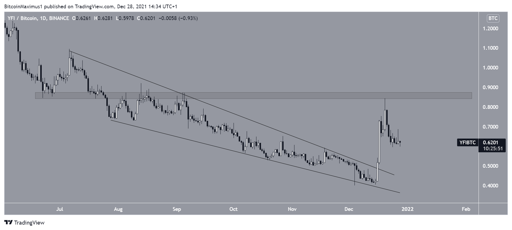 Có mức kháng cự mạnh tại ₿0,86. Nếu YFI / BTC vượt qua mức này, tốc độ tăng dự kiến sẽ bắt đầu tăng tốc.