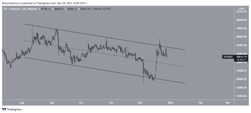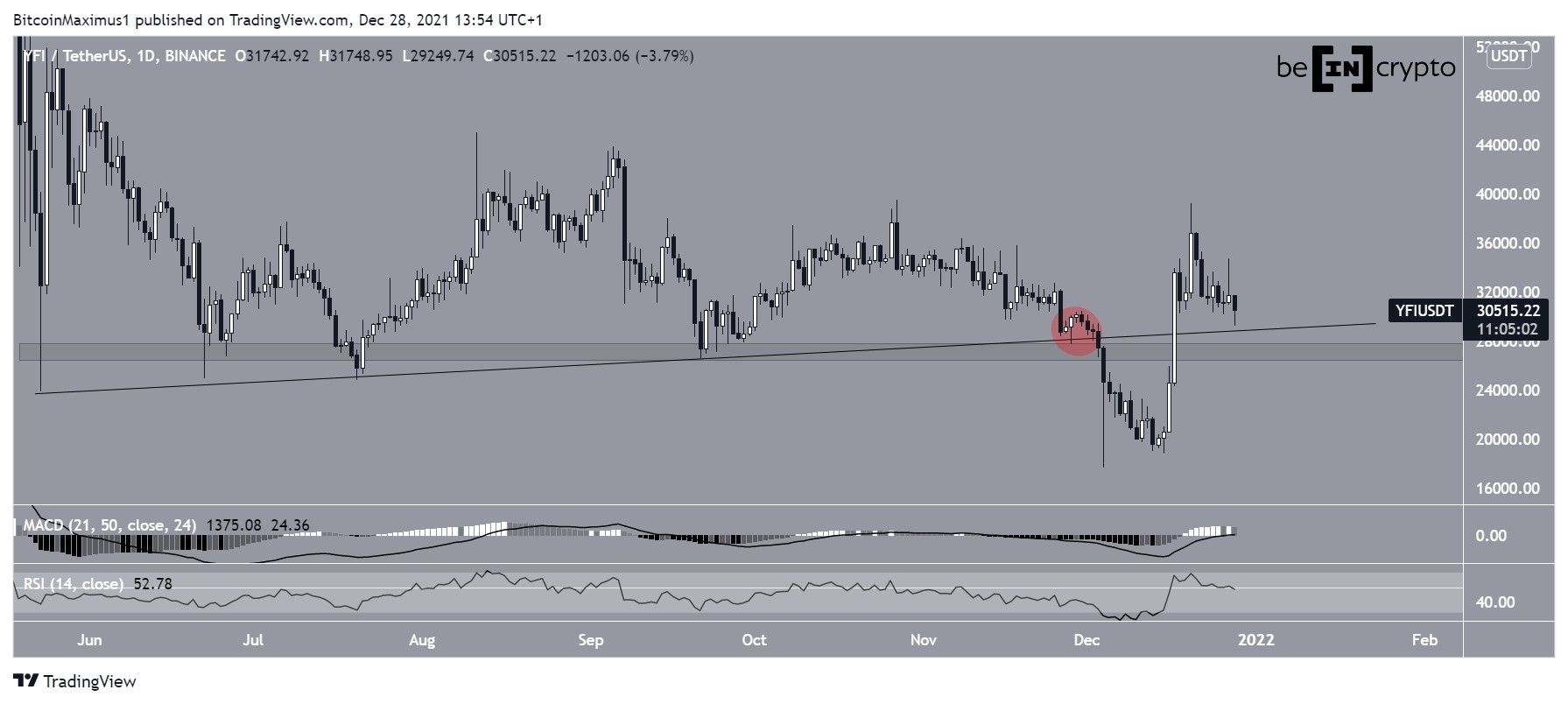 YFI đã phá vỡ khỏi đường vào ngày 28 tháng 11 (vòng tròn màu đỏ) và tiếp tục đạt mức thấp là 17,699 USD vào ngày 4 tháng 12.