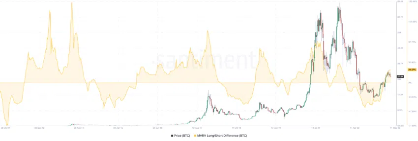 Chỉ số MVRV cao, cho thấy nhà đầu tư đang có lợi nhuận lớn. Trong lịch sử, khi MVRV đạt mức cao nhất cũng là lúc đánh dấu đỉnh của chu kỳ 4 năm của Bitcoin.