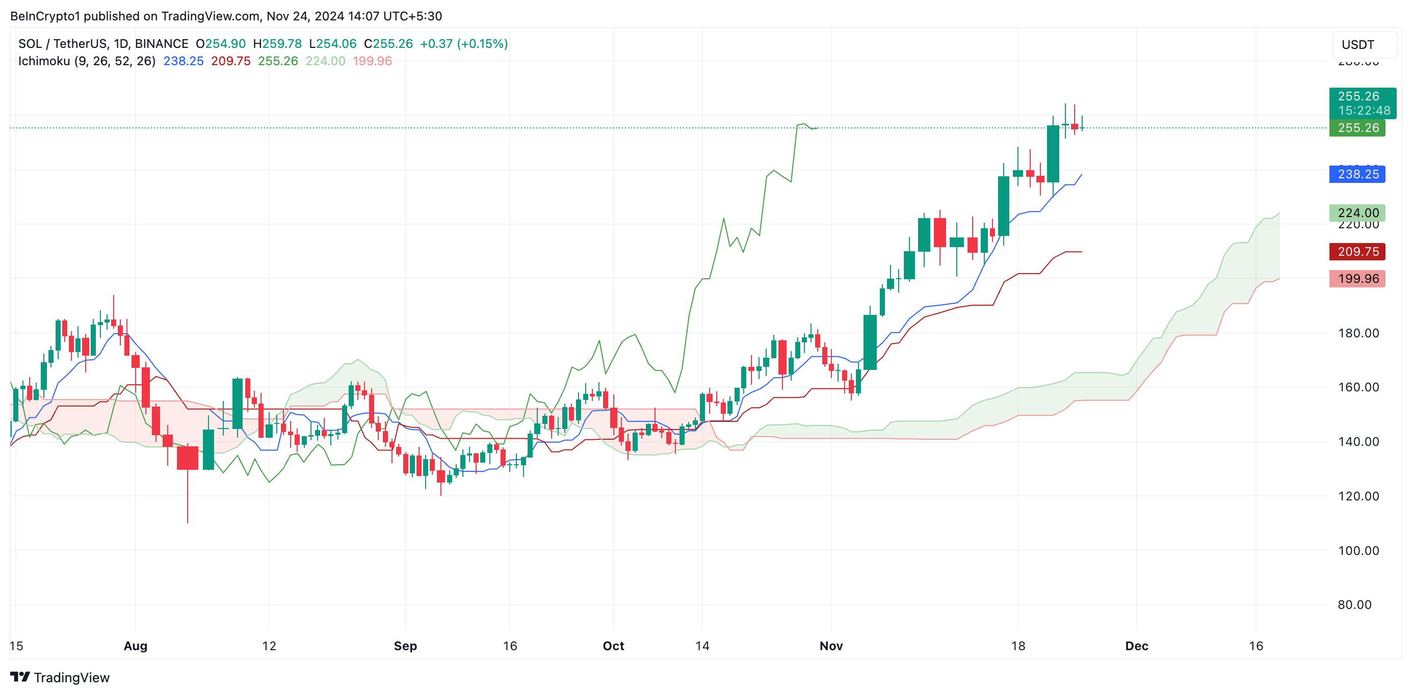 Giá của Solana (SOL) đã đạt mức cao nhất mọi thời đại mới là 264.39 USD trong phiên giao dịch ngày 23/11. Kể từ đó, giá đã điều chỉnh 3%, khiến Altcoin này giao dịch ở mức 255.12 USD tại thời điểm viết bài.