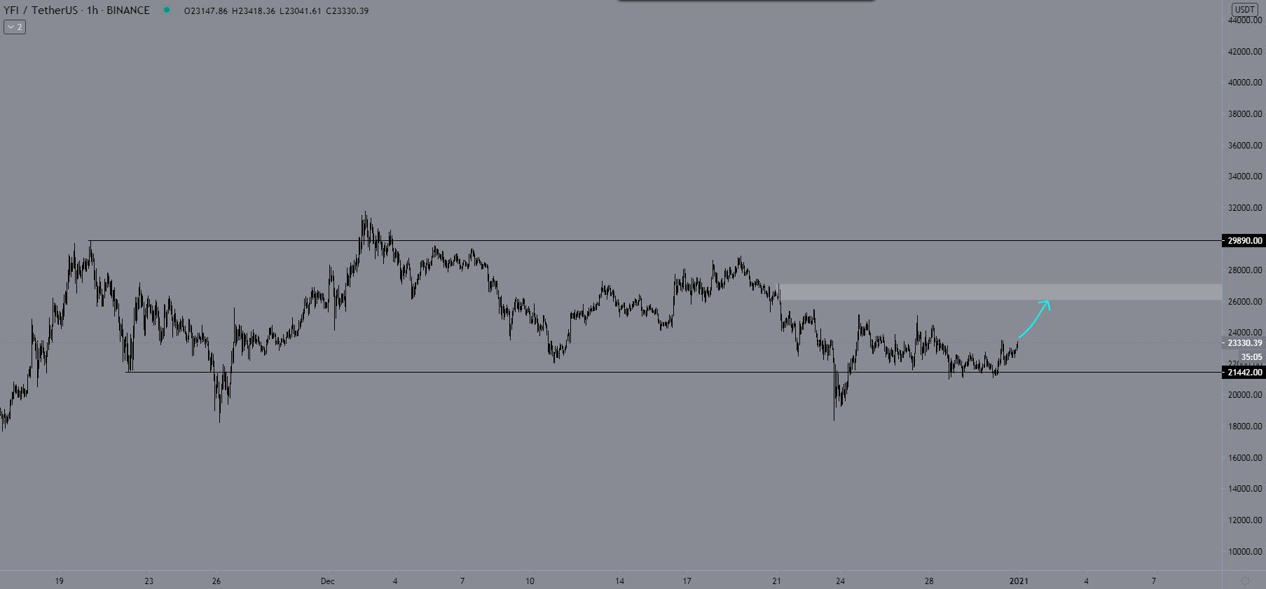 Lĩnh vực DeFi đang rất dễ bị tổn thương hơn bao giờ hết, khi hầu hết mọi con mắt giờ đây đang đổ dồn vào Bitcoin. Token YFI của Yearn.finance là một ví dụ điển hình. Nó đã duy trì xu hướng đi ngang trong khoảng từ 22.000 USD – 23.000 USD trong vài tuần qua.