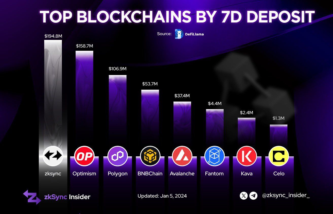 Có thể nói, zkSync dù là một giải pháp tuổi đời còn non trẻ, nhưng đã cho thấy sức hấp dẫn không thua kém những blockchain khác. Trong bảng xếp hạng sau từ @zksync_insider_ lấy dữ liệu từ DefiLlama, zkSync đã nhận số tiền gửi lên đến gần 195 triệu USD trong tuần đầu năm 2024.