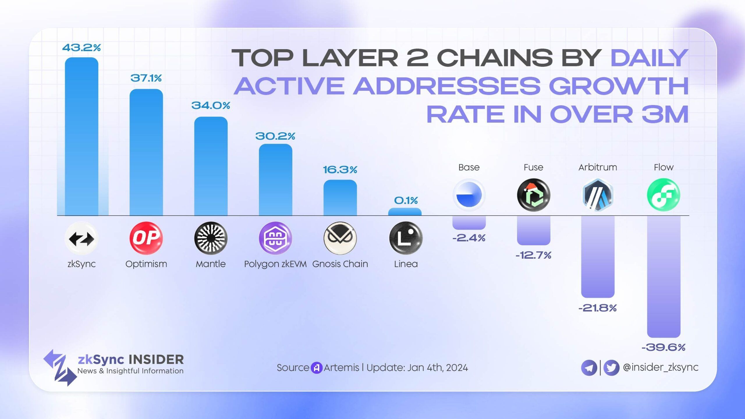 Theo dữ liệu của Artemis được @insider_zksync thống kê, zkSync cũng là Layer 2 có sự tăng trưởng địa chỉ hoạt động trong ngày cao nhất trong vòng 3 tháng, tăng 43.2%. Xếp sau là Optimism với mức tăng 37.1% và của Mantle là 34%. Có thể nói, giao dịch trên zkSync là sôi động nhất trong các Layer 2 giai đoạn hiện nay.